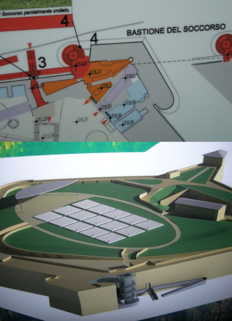 Il Bastione nella foto è parzialmente crollato e se ne prevede la “ricostruzione” con una scala-ascensore vetrata che “riprende” la forma originaria, come si capisce dallo schema planimetrico. Mi scuso per le poche immagini e per le pochissime informazioni ma un’opinione generale mi sembra che sia comunque possibile farsela.