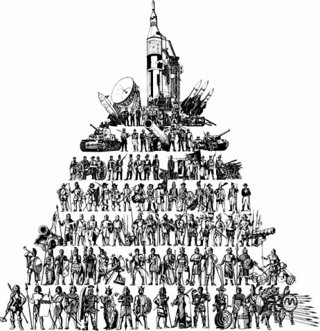 Nella trasposizione grafica della “Torre di Babele” ho appunto cercato di rappresentare il racconto biblico con un’impalcatura di uomini in armi (da quello Neanderthaliano con la rudimentale clava, via via fino a quello moderno con armi sofisticate), tutti rivolti verso l’obiettivo di un immaginario flash, in posa come in una foto ricordo, la foto dell’umanità che fa la guerra.