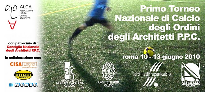 ALOA ha organizzato, nei giorni della Festa dell’Architettura di Roma, il Primo Torneo Nazionale di Calcio degli Ordini degli Architetti che ha visto scendere in campo le squadre degli Ordini di Roma, Reggio Calabria, Vibo Valentia e Trapani.