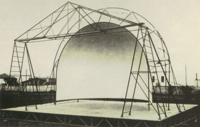 Mi scuso dell’ignoranza ma era uno studente liceale quando l’Istituto ci portò a vedere Vittorio Gassman che recitava l”Adelchi” di Manzoni a Villa Borghese nel suo teatro itinerante. Quel teatro, che mi colpì per la sua struttura, non so se é questo qui in fotografia. A me pare di ricordare piuttosto un tendone che si apriva come un’enorme conchiglia. Per certi aspetti mi ricordava il cinema Airone di Adalberto libera. Mah! Scherzi della memoria! Però ancora vedo l’Attore di bianco vestito che dritto, con voce drammatica, recita: “Dagli atri muscosi, dai fori cadenti….” Studiato a memoria a casa erano due palle! Sentito in quel luogo erano due brividi lungo la schiena!