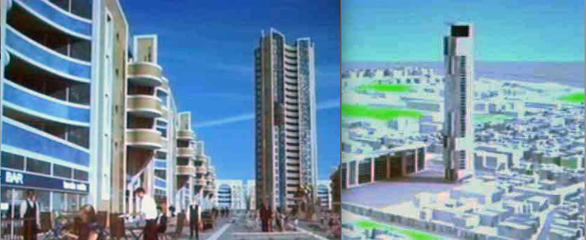 Tra le immagini ha anche fatto vedere l’alternativa di fondo per la piazza con un’orribile chiesa anni ’70 ed un campanile-minareto ispirato all’architettura dei missili intercontinentali!