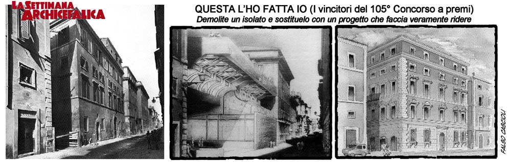 La soprintendenza alle “demolizioni e cementificazioni”, dopo aver avallato l’edificio di Meier a taciuto davanti alla frase arrogante di Odile Decq (“siccome ci hanno detto che dovevamo rispettare le facciate abbiamo deciso di smontarne un pezzo per far vedere che c’eravamo anche noi”) e così via, siccé oggi siamo qui a chiederci se sia giusto o meno violentare via Giulia e l’edificio dell’Unione Militare. Se ne può concludere che, come dice Muratore, “non ci sia proprio niente da ridere!”