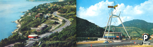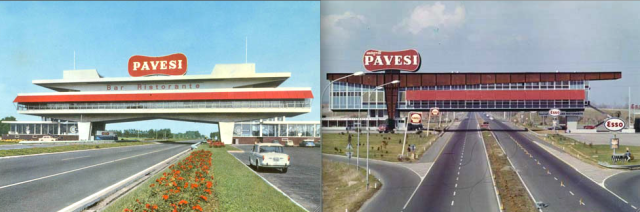 Ma li ricordo fin da bambino, questi autogrill nuovi di pacca, il “futuribile dolce” del boom, così diverso dal futuribile aspro e gelido (e umoristico … ma il loro umorismo è tale, in genere) degli inglesi.