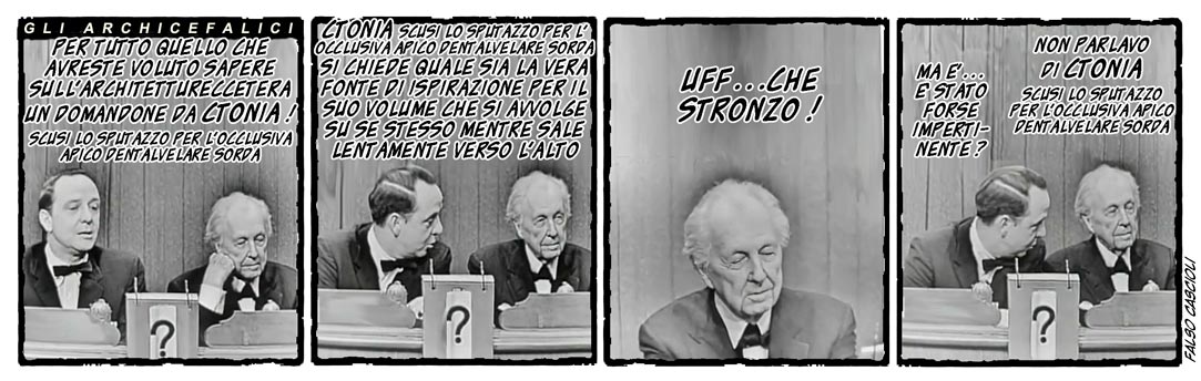 Spettabile Professore, io la conosco solo per la sua pubblicistica, ho in libreria il volume da lei curato per la Storia dell’Archiettura Italiana Electa, e mi diverte seguirla nei suoi exploit in rete, ma stavolta credo che questo Falso Calscioli abbia colmato la misura. Paragonare un capolavoro dell’architettura contemporanea a un escremento significa gettare fango, e uso un eufemismo perchè non voglio scendere al suo livello, su tutta una generazione di architetti che sulle architetture di Wright si è formata sentendosele propagandare all’università (ricordo ancora i consigli dei miei assistenti, e sto parlando di oltre quarant’anni fa, di ripassare con carta lucida, su L’Archiettura Cronache e Storia, quei disegni pubblicati in dimensione francobollo e le foto che invece erano enormi per dare l’idea della sublimità spaziale. Insomma io in quell’architettuta ci ho creduto e questo Falso Cascioli non può buttarmela “in caciara”, come si dice dalle vostre parti, anzi, peggio: in fogna. Non si tratta così la cultura e nemmeno i ricordi.