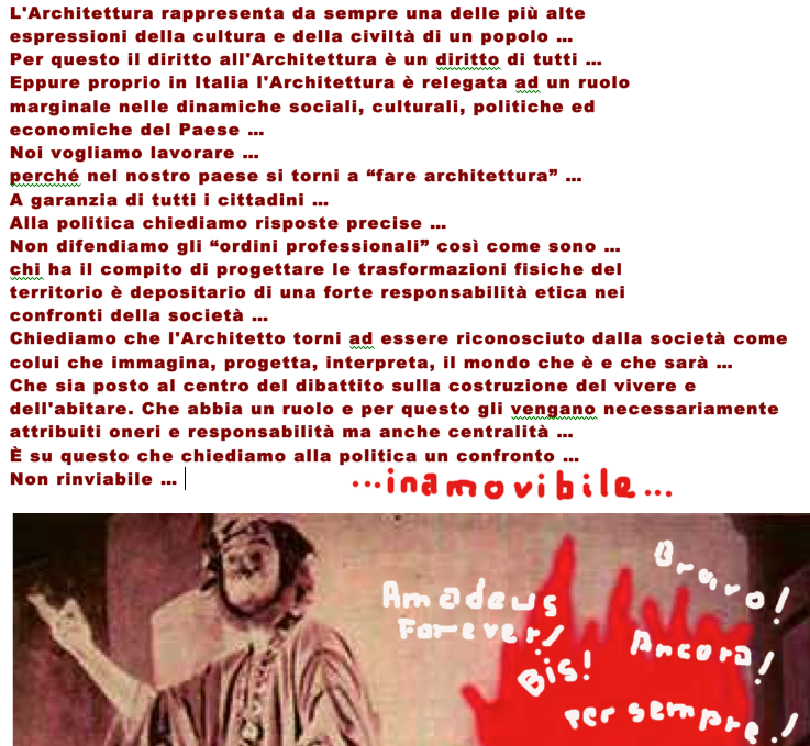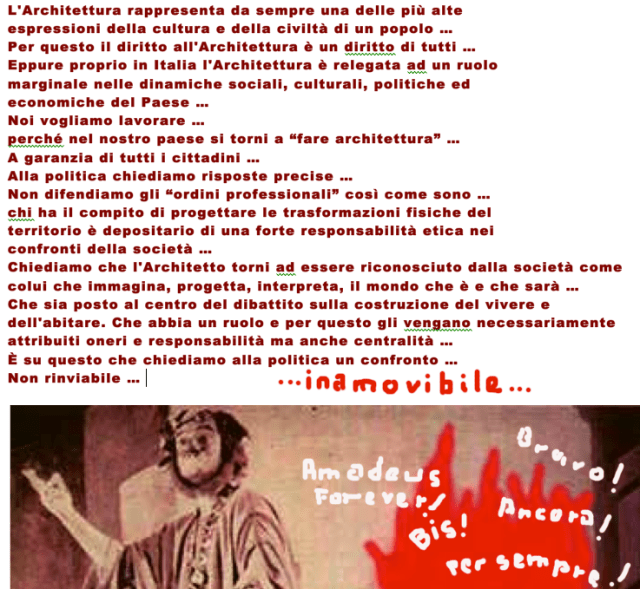 se legge bene, nel mio messaggio dico che, se il testo fosse venuto da un’altra fonte l’avrei considerato condivisibile, ma leggendo le cose che l’intero testo recita, a proposito di rispetto, di casta, di garanzie, di etica, se permette mi viene da ridere. Giusto per farle un esempio, una volta, avendo un problema con un cliente moroso, e sapendo che l’ordine metteva a disposizione dei legali, sono andato per una consulenza … ho poi scoperto che la consulenza in sede serviva solo all’avvocato per farsi dei clienti che, per avere una vera consulenza, dovevano andare privatamente da lui. Mi sono sempre chiesto in base a quale principio l’ordine si avalesse di certi professionisti, e mi sono anche dato qualche risposta. Poi potremmo parlare dei vari corsi formativi tenuti presso l’ordine, e vedere chi li gestisce e in base a quali titoli. Poi possiamo parlare del modo ideologico in cui si decide cosa pubblicare e cosa no su AR, ecc. ecc. in poche parole, definirli con la ruga al centro del viso è un eufemismo. Questo non significa che tutti gli architetti di Roma e provincia siano tali (lo sarei anch’io), il mio riferimento va ad alcuni nomi riportati nell’elenco.
