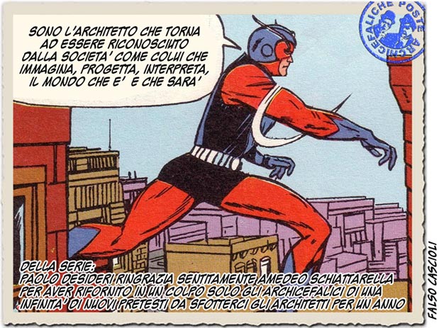 Siamo d’accordo e ci stiamo pure noi a prendere per allocchi l’universo mondo, abituato a bersi le più stravaganti archicefalate, è uno scherzo ben riuscito, pure se costosetto ma lo pagano gli architetti quindi ci si può stare, però che almeno ci sia riconosciuto in una nota in margine di essere gli Archicefalices ex Machina dello Schiattarellus ex Machina !