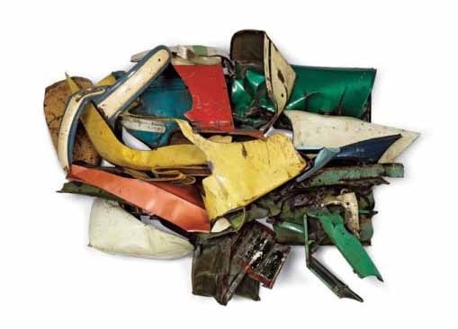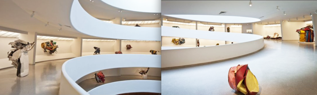 A me piace. L’accostamento di colori e forme è molto convincente, e fa dimenticare il fatto che sia stato ottenuto attraverso pezzi automobilistici privi di alcun valore. Mentre – ad esempio – in molte cose di Tinguely si mantiene una parvenza e una funzionalità meccanica degli elementi (ri)utilizzati – e che anzi viene spesso esibita cineticamente – con queste opere, abbandonandosi al riuscito gioco di forme e colori, ci si può persino “dimenticare” del fatto che ciò che si sta guardando siano soltanto rottami. Se siamo in grado di apprezzare la poesia di Melotti o la malinconia di certe opere di Colla… non vedo perchè non sia possibile almeno “accettare” anche i lavori di questo artista: più che altro… è la cornice espositiva del Guggenheim che non funziona – e forse, espositivamente, non ha mai funzionato davvero.