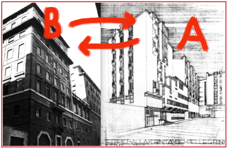 L’immagine è da leggere da destra a sinistra: progetto neoliberty (in questo stile è stata fatta solo la parte di fondo) e realizzazione neorazionalista romana ovvero la ragione applicata al processo storico e non più soltanto alla funzione (se ‘neorazionalismo romano’ non vi piace scongiuro il professor Muratore di fare il suo mestiere di critico e trovare un appellativo per questa scuola. Purtroppo “organica” che sarebbe il più appropriato ormai se lo sono scippato gli zeviani con diversa declinazione. Tanto è stata forte la damnatio memoriae culturale che nessuno storico dell’architettura contemporanea si è preso la briga di battezzare questa corrente che ha coinvolto più architetti di altre se non derivandola dal suo iniziatore.
