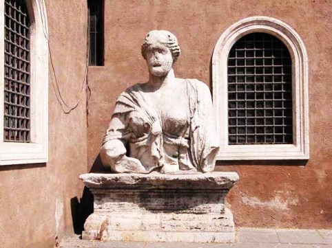 E’ ipotesi di un certo interesse che Madama Lucrezia possa essere, dal nodo della tunica sul petto, la statua di culto della dea Iside posta nell’Iseo Campense, sotto Santa Maria della Minerva. Poco lontano dalla chiesa con l’unico originale interno gotico, in un angolo di Via Santo Stefano del Cacco e proveniente appunto dall’adiacente Via Piè di Marmo, c’è probabilmente, in un elegante calzare, un altro frammento di Madama Lucrezia. Lei potrà non farcela più a rimirare noi e i nostri affanni, (pensa, poveraccia!, quanto le dovevano fischiare gli orecchi quando una voce roboante lì vicino urlava “Lo volete voi?” e migliaia di illusi esaltati rispondevano “Si!!!!”) ma noi amanti di Roma, cosidetti “romanisti”, al contrario, non possiamo fare a meno di aruspare qua e là, nei vicoli e vicoletti, storie, leggende, curiosità e varie amenità.