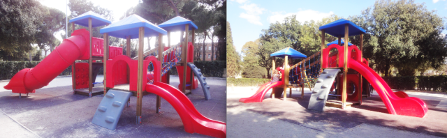 tra l’altro su quelle scalette per lo scivolo grande, manca, direi, il primo gradino, e ogni volta che vado al parco nemorense mi tocca, come a tanti genitori, aiutare i miei figli treenni ad arrampicarsi…