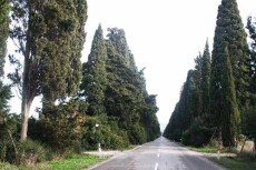 Giù de’ cipressi per la verde via,