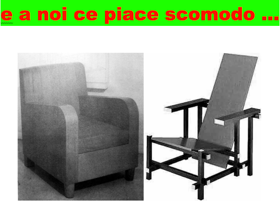 Queste due poltrone le conosco, una molto bene essendo ancora in famiglia, l’altra soltanto vista sui libri prima che, per la prima e unica volta, mi ci sedessi sopra. Della prima ho il vivo ricordo di quando, sdraiato comodamente su uno dei braccioli, il braccio intorno al collo di mio padre, lo ascoltavo mentre, battendo il palmo della mano sull’altro bracciolo a mo’ di tamburo, cantava per mio divertimento nenie arabe che aveva appreso negli anni giovanili trascorsi, prima dell’ultima guerra, in Somalia. Adesso ci faccio delle altrettanto comode pennichelle pomeridiane, le gambe allungate sul puff. L’altra invece l’incontrai quando una società cinematografica che aveva fornito fino ad allora tutto l’occorrente, mobili, soprammobili, armi bianche e non, ecc. ecc. ecc., agli scenografi e arredatori di Cinecittà, aveva deciso di chiudere l’attività mettendo all’asta la messe enorme dei suoi magazzini. Ci andai incuriosito e….,avete presente la grotta di AliBabà? Nei vasti spazi c’era di tutto! Dall’elmo dei legionari agli archibugi, dalla sedia curule alla credenza fiorentina, dalle alabarde ai lampadari, riconobbi pure un centro-tavola in ceramica bianca che avevo visto in un film di Totò dato qualche tempo prima in televisione ma la signora con cui entrai in gara ne aveva più desiderio di me. Medioevo, mobili veneziani, modernariato, Art Decò, una lounge-chair lecorbuseriana e una “sedia rossa e blu”. Oh! “Proviamola finalmente!”, mi dissi. Ergonomia allo stato puro! Seduta, schienale e braccioli di giusta inclinazione. Nessuna polverosa imbottitura e semplici tavole da ripassare con uno straccio! Innocenti colori come quelli dei legnetti per le costruzioni dei bambini. Sì, vabbè! Ma, dopo il primo desiderio, la domanda: “Dove la mettevo? Magari avessi avuto una terrazza o un porticato!”. L’unico difetto era quello: Sedia o scultura? Ma per il resto il “sedervi era una gioia”!