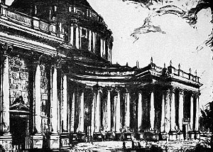Nel 1929, il grande Armando Brasini venne incaricato di costruire a Roma, in via IV Novembre, un edificio che rimpiazzasse il demolito Teatro Nazionale di Francesco Azzurri. Il Teatro era stato demolito, nonostante la notorietà dell’autore e l’importanza funzionale dell’edificio, perché ritenuto inadeguato al carattere architettonico di Roma. D’Annunzio accusò la facciata di «essere pretenziosa e volgare e la tettoia in vetri orribile perché è una cosa industriale, brutta, meschina, comprata un tanto al metro, appiccicata là a far da testimonianza alla taccagneria che ha presieduto al compimento di tutta la parte ornamentale!» Mussolini ritenne Brasini l’unico architetto degno di poter mettere le mani su quel delicatissimo punto di Roma, tra l’altro allineato frontalmente a Palazzo Venezia, e si compiacque del progetto che dimostrava la validità della scelta dell’architetto.