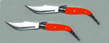 vengono fuori due coltellacci a serramanico scintillanti dalla presa rosso-rubino …
