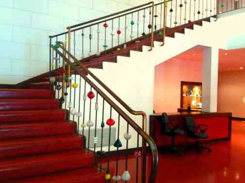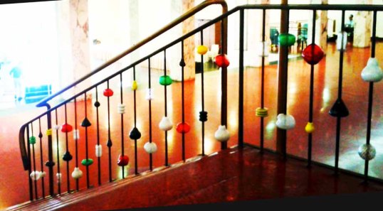 P.S. Sul detto “nodo” allego immagine dell’elegante ringhiera (metallo e vetro) che mena al bar del teatro Mediterraneo (1940) di Napoli. La mia amica Anna l’ha fotografata ieri col suo telefonino al blindatissimo WUF tenutosi alla Mostra d’Oltremare partenopea. In cambio le ho pagato il caffè. Grazie Anna!!