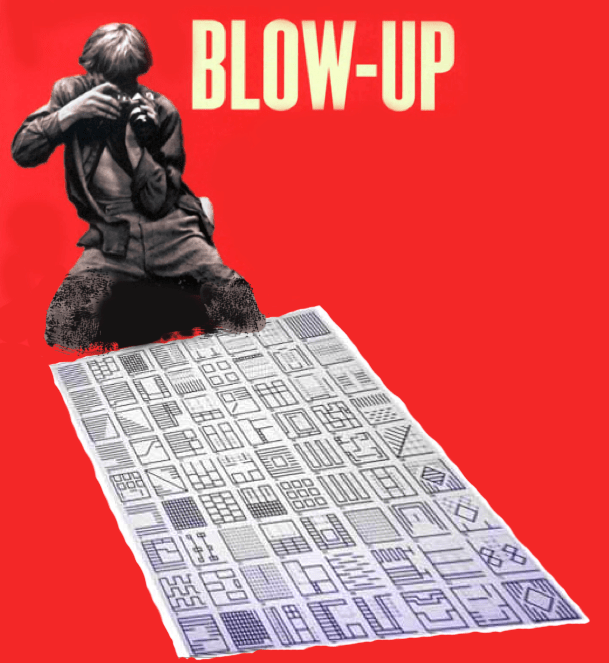 Prego notare come il fotogramma “00,10”, con Veruschka che attraversa la strada sulle orizzontali strisce pedonali, è la copia del Morfema puriniano “N° 1” mentre successivamente, con Veruschka che scende i gradini delle scale tagliati dalle ombre, il fotogramma “00,19” è la copia del morfema “N° 3”. Questi morfemi erano ben conosciuti dagli studenti di allora. Il vero problema epistemologico è: “Viene prima “Blow Up” o l’Abaco?”, cioè, “Viene prima l’uovo o la gallina?”.