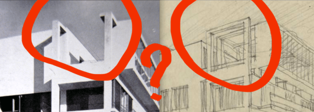 “Perchè non avrà concluso il telaio con la trave superiore, come nello schizzo? Senza questa l’aggetto sul fronte appare scollegato, instabile e periclitante. Condizione accentuata forse dal non allineamento del telaio al fronte finestrato laterale, anche questo diverso dallo schizzo.