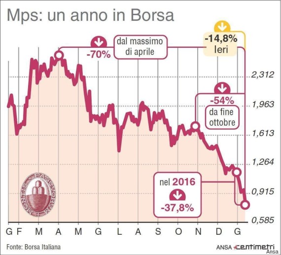 Non si arresta la discesa di Mps. Ha ritoccato il minimo storico a 0,76 euro per azione. Andamento del titolo in Borsa nell’ultimo anno in una infografica realizzata da Centimetri, 18 gennaio 2016.