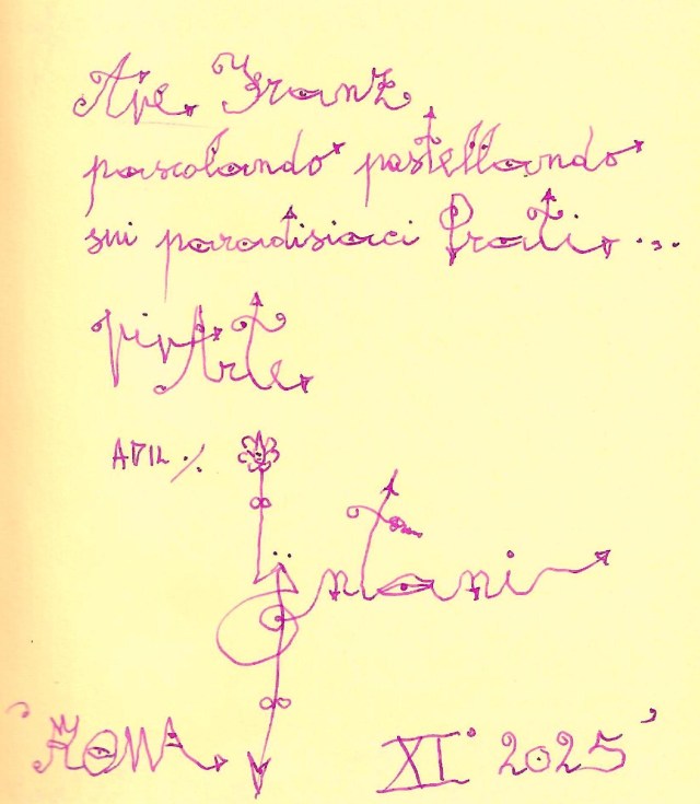 Il CSGM saluta Franz Prati con una dedica del Maestro Luigi Ontani “Ave Franz pascolando pastellando sui paradisiaci Prati ViviArte sempre”. Adil/Ontani Luigi.