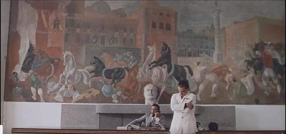 La Casa della Giovane Italiana di Gaetano Minnucci (1934) all’Aventino decorata dallo splendido affresco “La Corsa dei Berberi” di Corrado Cagli – e oggi trasformata in Accademia Nazionale di Danza – é nella finzione cinematografica il commissariato in cui Tunin (Giannini) viene assassinato dopo l’interrogatorio