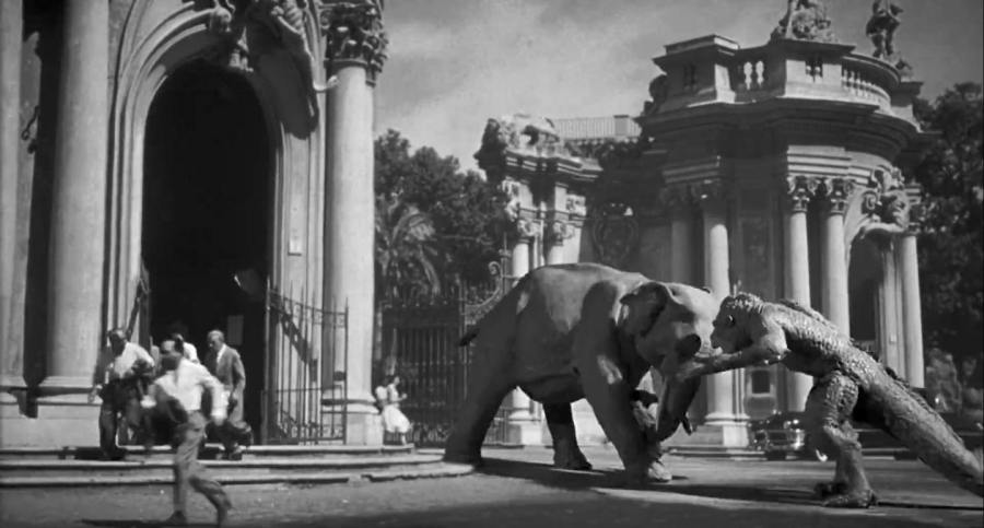 L’ingresso monumentale del Giardino Zoologico progettato da Armando Brasini (1911) fa da sfondo, nella finzione cinematografica, al combattimento tra il mostro ed un elefante.